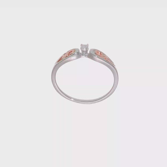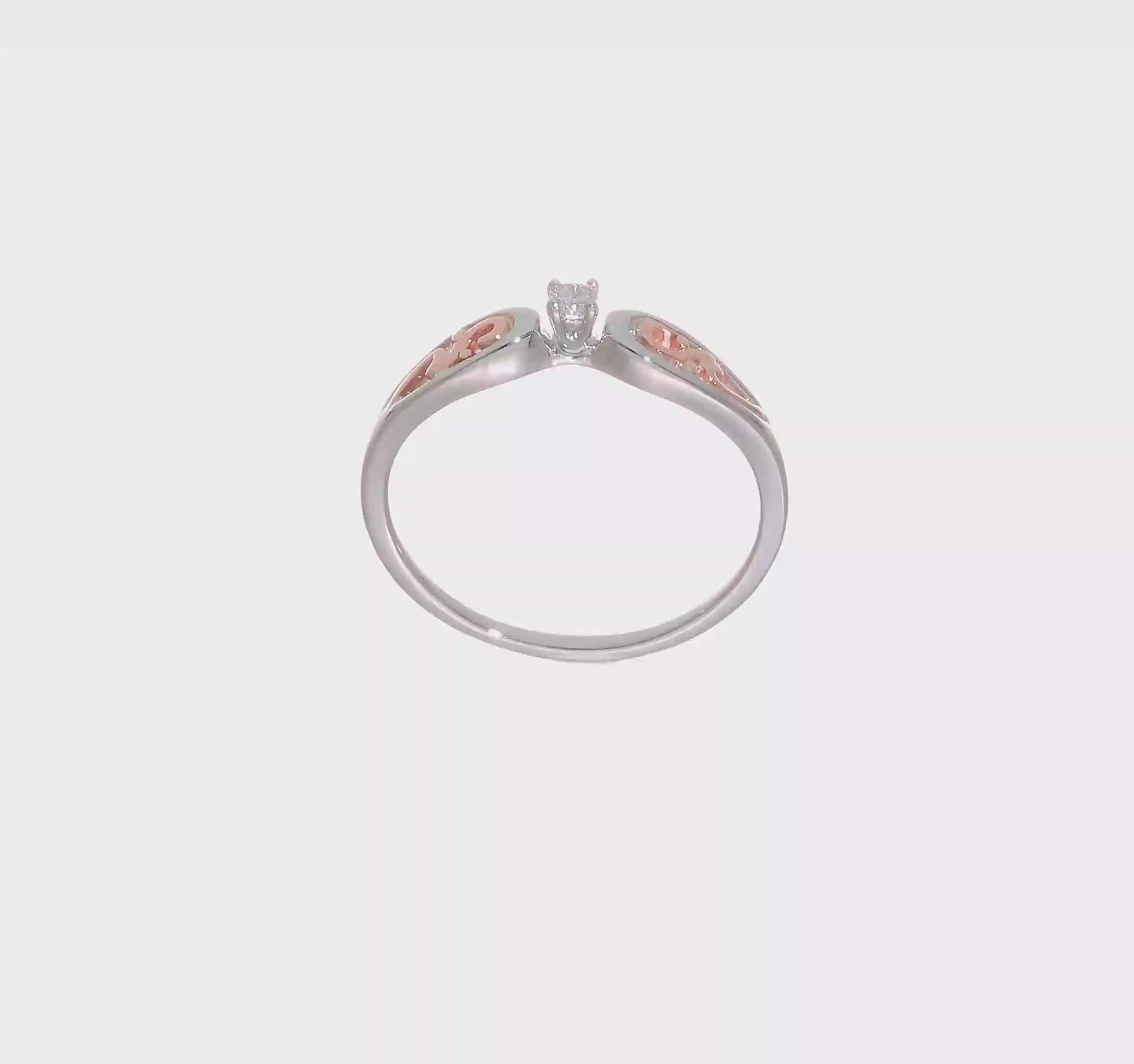 This elegant 14k white and rose gold engagement ring features a 1/20 ct round diamond and a two-tone color design, making it a tasteful and premium choice. Made with high-quality materials and finished with a polished coating, this ring exudes sophistication and exclusivity. The solid construction and open back design add to its overall beauty, while the intricate manufacturing process ensures its quality and durability with a delicate band width of 1.2 to 2.1 mm, this ring is a complete and perfect symbol of love and commitment. 1.74 Grams