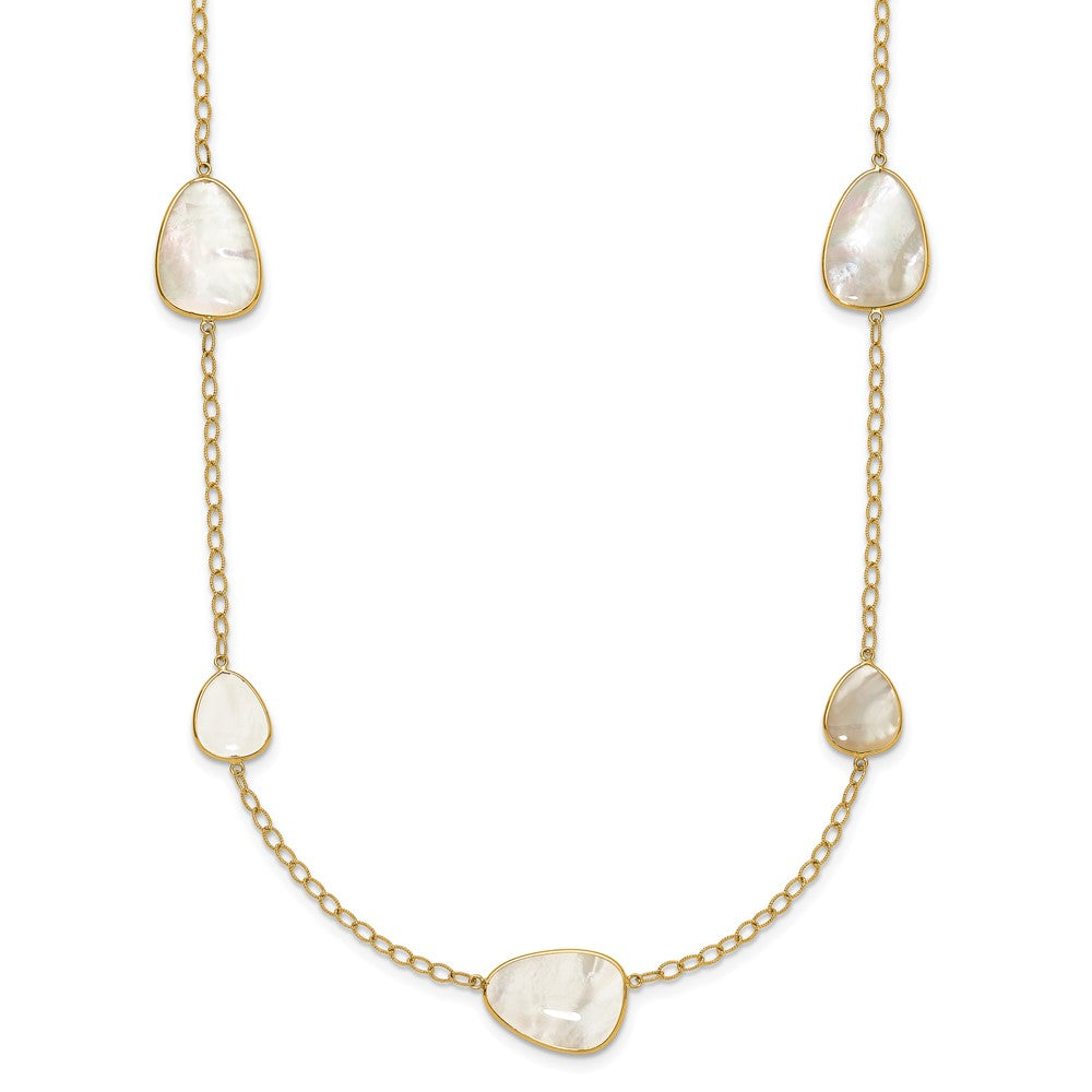 Elevate your style with this exquisite 14k yellow gold necklace featuring lustrous mother-of-pearl in a distinctive fancy link design. The polished gold finish beautifully complements the iridescent sheen of the mother-of-pearl, creating a versatile piece that transitions effortlessly from day to evening wear. This timeless treasure adds a touch of sophistication to any outfit.
