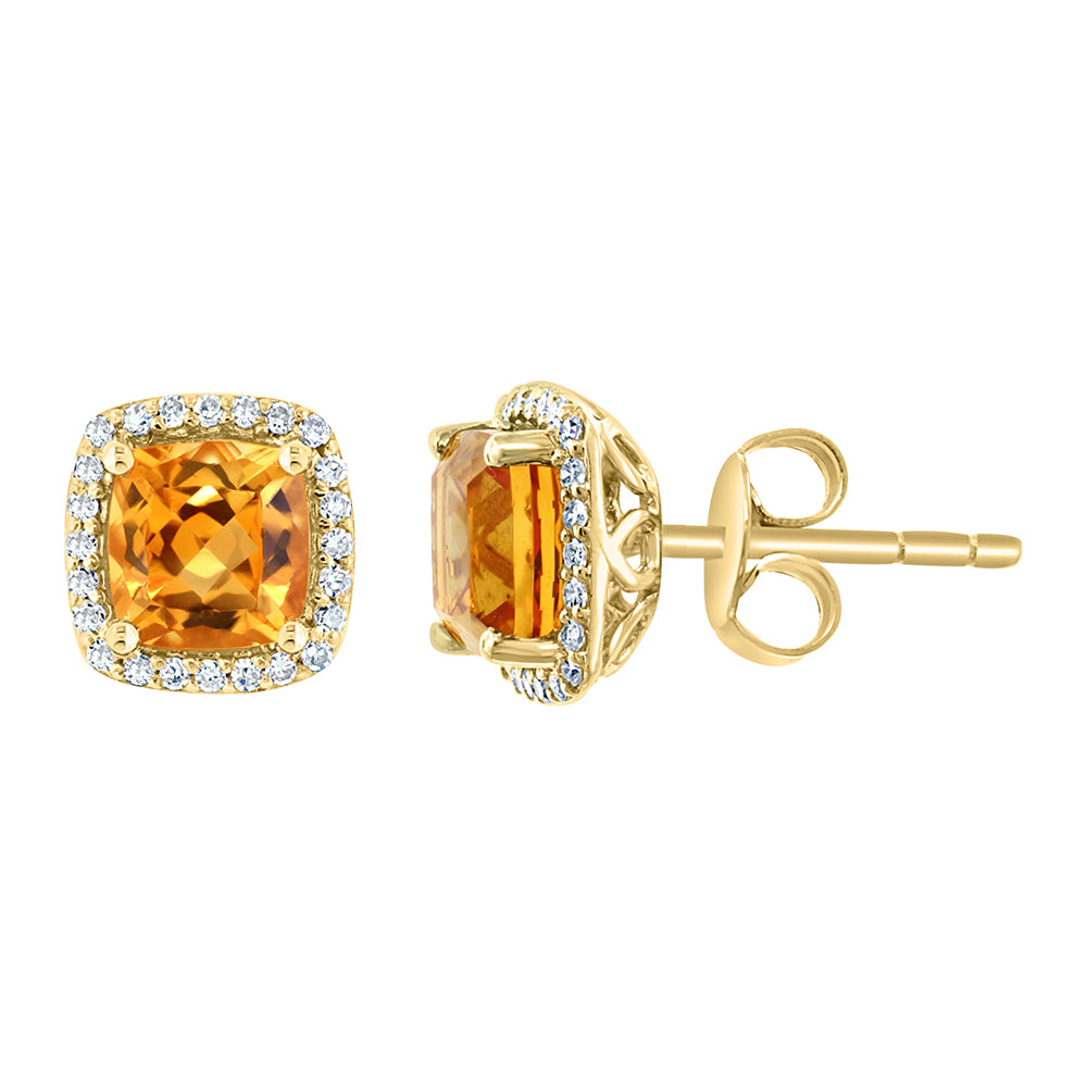 PRODUCT DETAILS: 14k Yellow Gold 1.9ct Cushion Cut Citrine and Diamond Stud Earrings, Stone Type- Citrine, Total Carat Weight- 1.9cttw