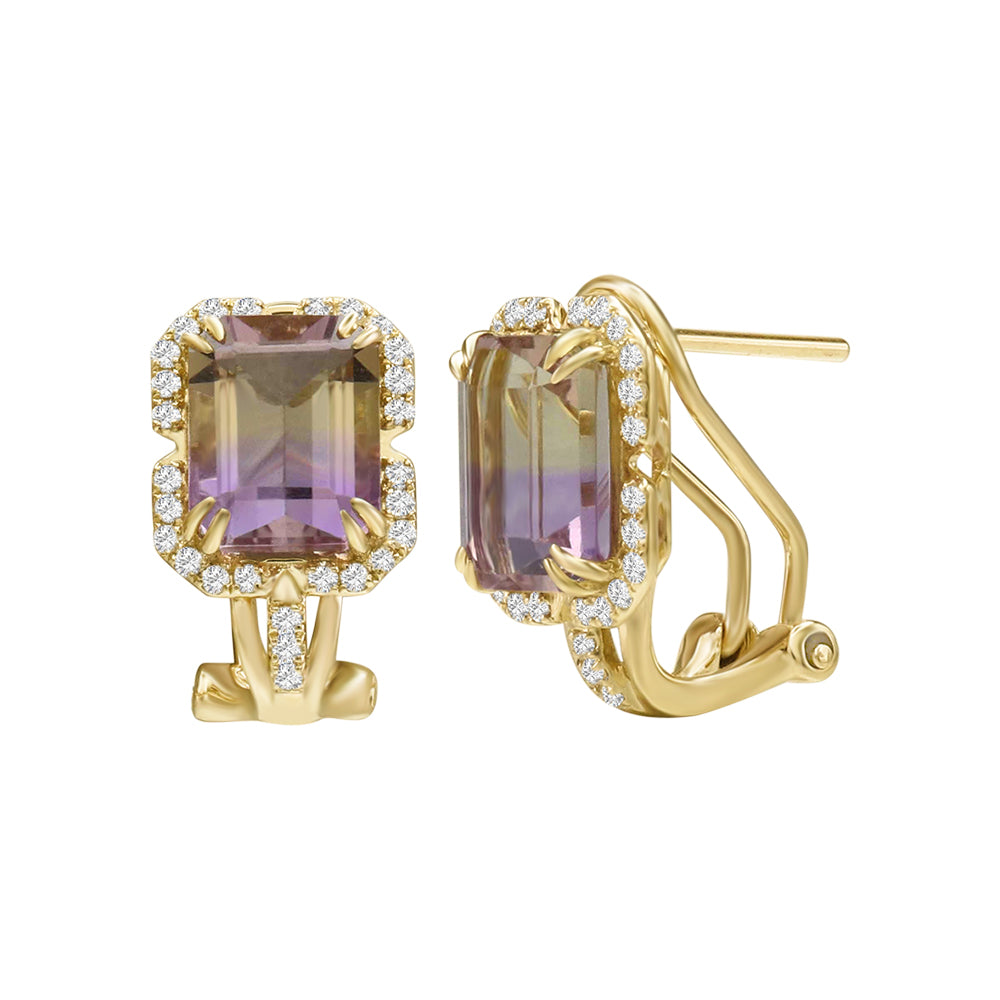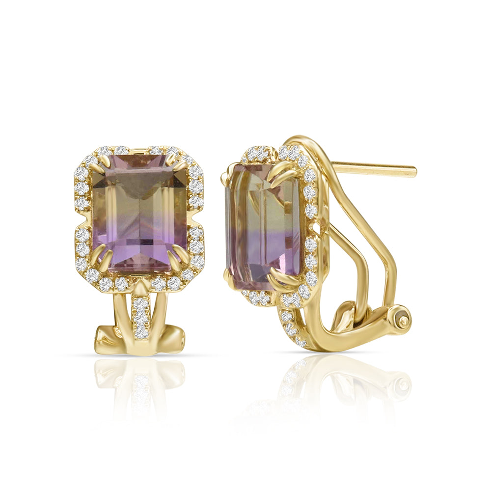 PRODUCT DETAILS: 14k Yellow Gold 5.34ct Octagon Cut Ametrine and Diamond Stud Earrings, Stone Type- Ametrine, Total Carat Weight- 5.34cttw