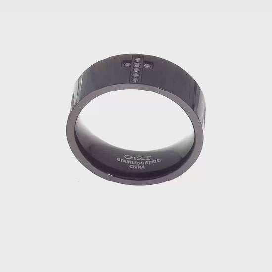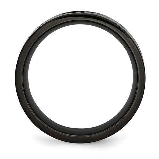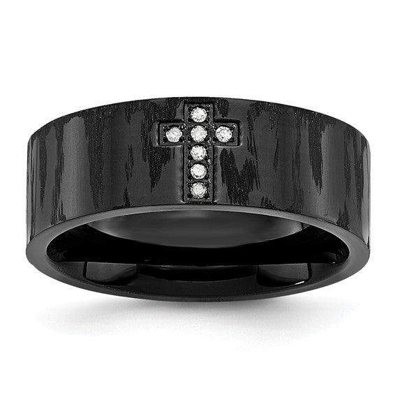 Transform your style with the stunning Stainless Steel Polished and Matte Black IP-plated 1/20 Carat Diamond Cross Band Ring. Showcasing 0.05 total carat weight of sparkling diamonds, this 8mm wide ring is made of high-quality stainless steel and boasts a standard fit that is comfortable to wear. This unisex ring is also engravable and comes in a sleek gift pouch, making it the perfect jewelry piece for any special occasion. Elevate your look with this breathtaking wedding band that combines the beauty of white and black plating to create a unique and bold design. Experience the luxurious and timeless appeal of natural diamonds in a modern setting with this must-have ring.